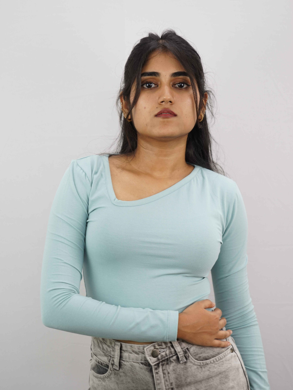 A modern twist on a classic style, this top features a bold asymmetric neckline and full sleeves, creating an elegant yet edgy look. Its cropped fit makes it perfect for layering or wearing as a statement piece, bringing a fresh, chic touch to your wardrobe.